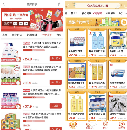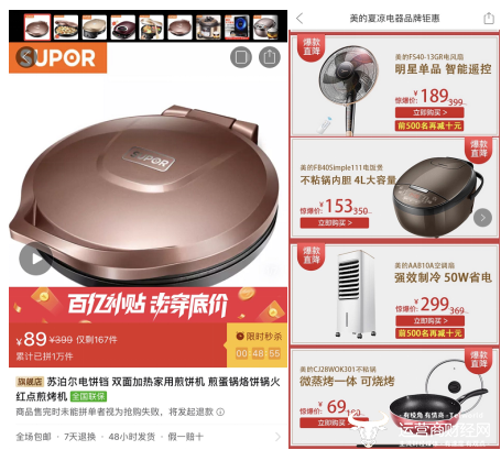 活动数据显示,家电数码、日化、母婴类产品拥有最高的达成率:190元的美的电压力锅、89元的苏泊尔煎饼机、54.9元的九阳榨汁机、259.9元的格兰仕微波炉等家电系列标品,成为截至目前的明星产品。汰渍、多芬、七度空间等个护洗护类高频消费品,在平均成团时长上占据明显优势;“上海老字号品牌特惠专场“则在整体成交转化率上维持领先。