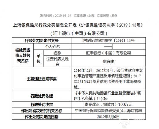 近日上海银保监局公布行政处罚信息公开表显示,汇丰银行(中国)有限公司因贷款自主支付事后管理严重违反审慎经营规则;部分信用卡资金用于非消费领域,被上海银保监局责令改正,罚款共计100万元。