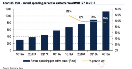 ▲拼多多的人均用户消费将持续增长,2018年人均消费为人民币1,127元