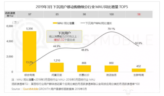 在拼多多的带动下,电商下沉市场维持高速增长,综合电商的活跃渗透率TGI达97%,月活用户同比增速为13.2%。