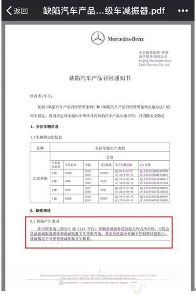 同时,在2018年7月份国家质检总局就向广大车主发出过奔驰E级汽车缺陷警告通知,同时还征求过相应的信息。在今年1月初,中国汽车质量网又发布了《关于北京奔驰E级减震器形变、断裂问题投诉征集》,据公开资料显示,奔驰的E级、C级、GLA、GLC等车型,都有减震器断裂的故障发生,涉及多个地区,数量庞大。