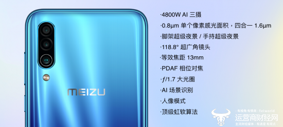 作为魅族首款AI三摄机型,魅族16Xs主摄采用GM1 Mod 版传感器,像素高达 4800 万,支持像素合成,可将每 4 个 0.8μm 的像素点合成 1 个 1.6μm 的超大像素,支持 AI 场景识别;副摄是 500 万像素的黑白摄像头;同时新增了一个800万像素的超广角摄像头,视角可达到118.8°,等效13mm焦距,拥有超大广角。