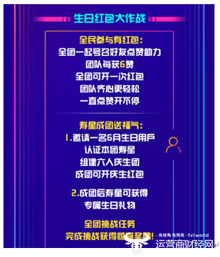 如果你身边有6月出生的朋友,那么恭喜你!赶紧拉过来组团参加奖池超过1亿的“生日红包大作战”,组成1位寿星+5位普通用户的豪华阵容,寿星可领专属实物生日礼物,全团获得成团大红包,最高可得4999元。团队还可以一起开启挑战任务,满500赞可抽上限49999元的“全团人人清空购物车”梦想大奖。