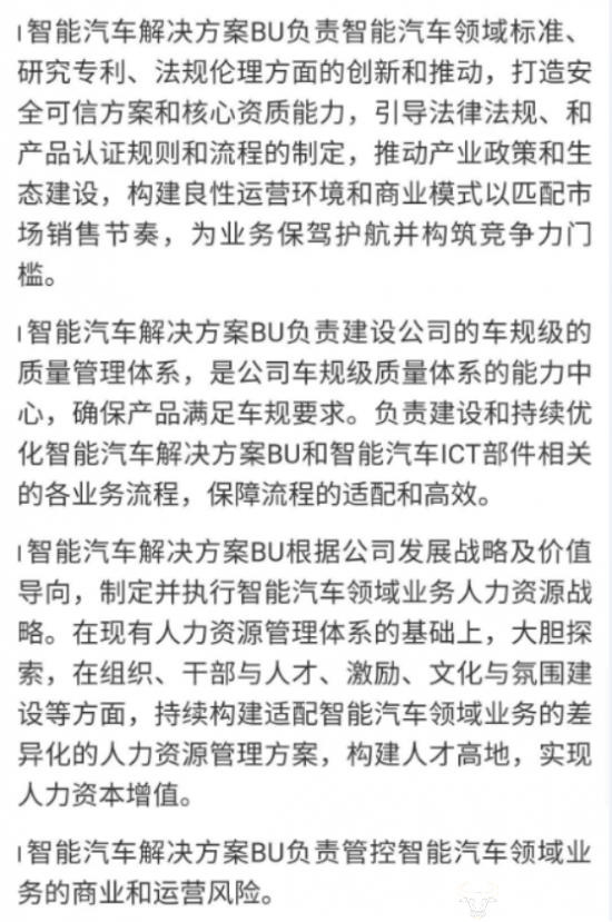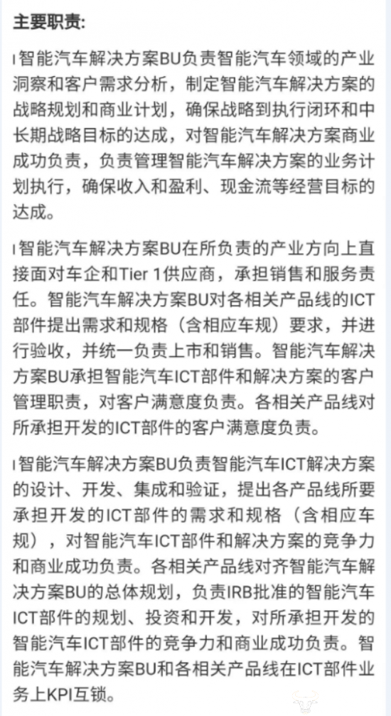 据公布的消息得知,在职责上,智能汽车解决方案BU是负责智能汽车领域的产业洞察和客户需求分析,制定智能汽车行业解决方案的战略规划和商业规划;负责产业方向上直接面对车企和Tier1供应商,承担销售和服务责任;负责追能汽车ICT解决方案的设计、开发、集成和验证,提出个产品线所要承担开发的ICT部件的需求和规格;负责智能汽车领域标准、研究专利、法规伦理方面的创新和推动;负责建设公司的车规级的质量管理体系,制定并执行智能汽车领域业务人力资源战略,管控智能汽车领域业务的商业和运营风险。
