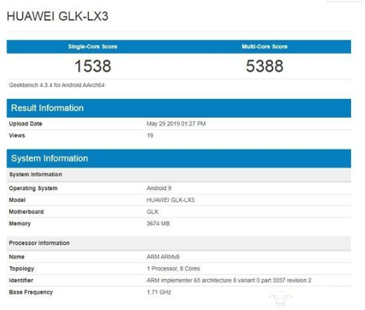 日前,安兔兔官博表示,安兔兔后台数据库出现了一款型号为“GLK-LX3”的华为新机,综合跑分十三万多。该型号的新机型同样现身GeekBench跑分网站,单核成绩1538,多核成绩为5388,。不出意外的话,新机型很可能是即将发布的华为nova 5i。