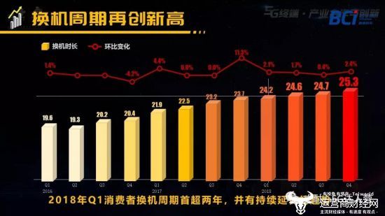 在中国手机市场,智能手机连续十年增长,但是从2017年开始连续下跌,月销量从4000多万台跌至2019年4月份只有2700万台左右。下跌的原因很多,除了市场规律、经济大环境因素以外,单纯从智能手机这一品类来审视,产品迭代变慢,无法有效吸引用户换机。根据BCI公司的数据分析,用户换机周期从不到20个月一直拉长到超过25个月。产业链、渠道商、消费者都需要新的技术改变目前的窘境,激活手机市场,5G无疑最适合担当此重任。