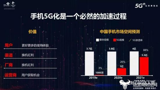5G手机将给普通消费者带来更多更好的使用体验,给渠道商和厂商等产业链各方带来巨大的换机红利(中国有超过13亿手机用户),给运营商带来更多的用户获取机会。近三年以来,智能手机的革命性迭代“乏力”,销量出现三连跌,用户和市场亟需新的革命性卖点出现,5G正好出现,中国手机市场有明显的“中国特色”,5G手机市场在普通消费者层面基本不需要做“用户教育”工作,认知度极高,只要是5G手机用户自然追捧。基于这些因素的分析,预计未来三年,5G将拉动整体手机市场销量逐步回升,2019年5G手机销量1000万台左右,2020年将达到1亿,2021年将超过3.5亿,基本完成对4G手机的市场份额切换。