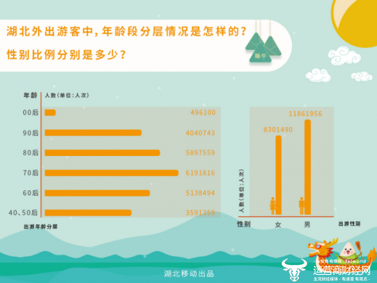 据中国移动湖北公司大数据平台监测显示,6月7~9日全省外出旅游的移动用户约有2556.76万人次,仅高峰时期出行人数就多达65.22万人次,出现在6月7日上午9时。这些出游人群中,80后、70后、60后是主力,占到了总体出游人数的67.4%。该年龄段人群大多具备一定经济基础,三天期间,全省重点旅游景点累计创下旅游收入超4.4亿元。而在整体出游人数中,男性用户出游热情明显高于女性,携程、美团、去哪儿是他们出行预定酒店最喜欢用的手机APP。