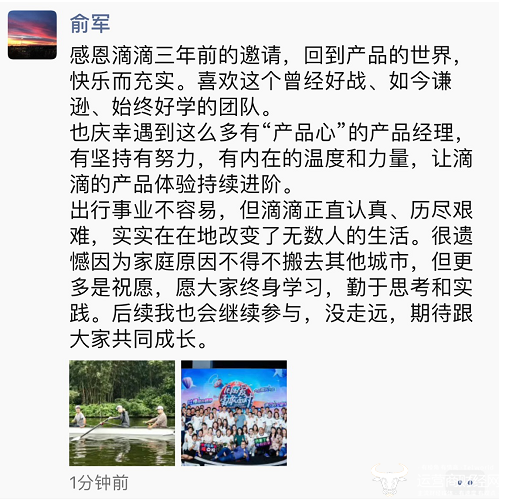 不久,俞军在朋友圈中,确认了该消息。他感慨到“感恩滴滴三年的邀请,回到产品的世界,快乐而充实……很遗憾因为家庭原因不得不搬去其他城市。”
