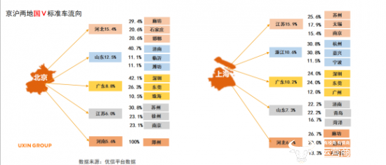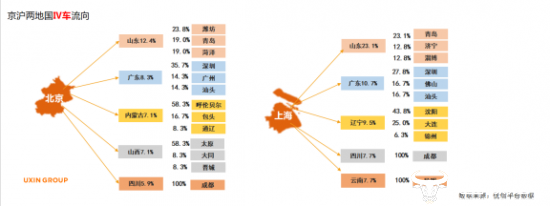优信研究院的数据显示,京沪两地国四车辆主要流入山东、广东人口大省;北京迁出地相对分散,上海迁出地集中度较高。