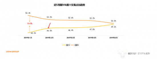 总的来说,京沪两地相较而言,差异明显。其中,2019年初,北京国五车辆的交易占比已达5成以上,且至4月,一直保持越高增速,5月趋势平稳,北京国五交易占比明显高于上海 。