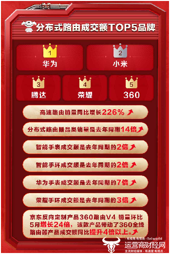 在今年京东618开门红当天,360品牌成为分布式路由成交额TOP5品牌之一。其中京东反向定制产品360路由V4 销量环比5月增长24倍,该款产品带动了360全线路由器产品成交额同比提升4倍以上。在6月13日,360成为智能家居品牌销售额排行榜中的TOP10。