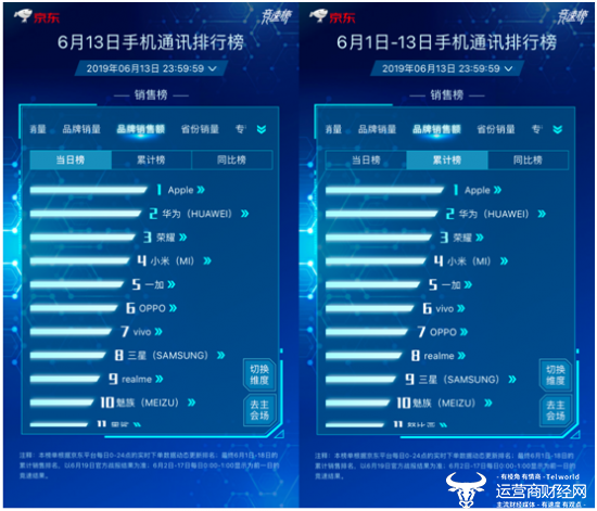 截至6月14日,京东618全民购物节已历时两周,在昨日手机神券日重磅福利的加持下,各大厂商在手机竞速榜上重燃战火,前几日的排名重新洗牌。Apple获得单品销量、品牌销售额两项冠军,荣耀交出单品销量亚军、品牌销量冠军的成绩单,与Apple平分秋色。