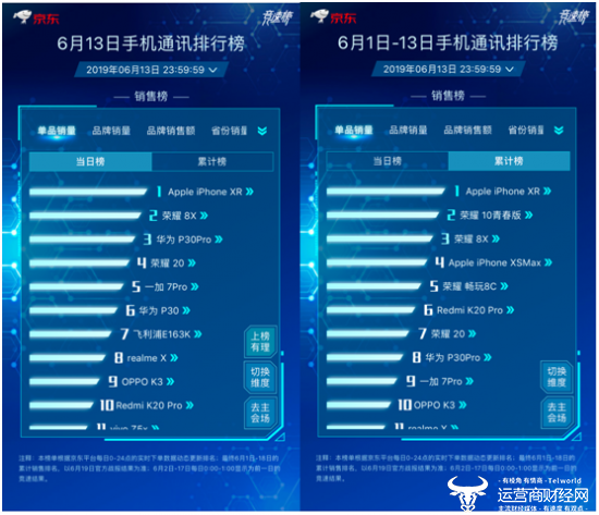 单品销量方面,iPhone XR的热度依旧不减,在当日榜和累计榜中均处于第一的位置。iPhone XR在618期间的持续走红,也让它成了当之无愧的“真香机”。荣耀8X获昨日销量亚军、累计销量第三,累计单品销量第二由荣耀10青春版保持。昨日单品销量的前十名,Apple和小米各有一款入围,荣耀和华为则分别占据两席。京东独家发售的一加7Pro自618开售以来一直表现良好,位居昨日榜单第五位,累计销量同样进入前十。
