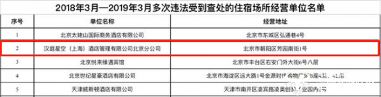 昨日,国家卫健委通报通报了在2018年3月至2019年3月期间住宿场所卫生专项整治情况,共有45家酒店上榜因多次违法受到查处的住宿场所名单。其中,被通报名单中不乏知名连锁品牌酒店,汉庭旗下分公司也赫然在列。