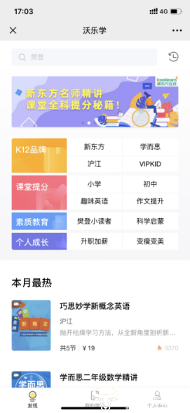 不仅如此,全新改版后的沃乐学页面内容框架更加丰富,分类内容涵盖小初高K12教育、学生课外兴趣素质教育、成人自我增值等几大板块内容,更有樊登、詹泽、鞠萍、汪苏泷等名师IP资源强势入驻,内容更加优质。