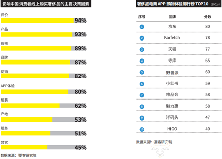 在要客研究院发布的《中国奢侈品电商报告》中,我们也看到,有很多因素在影响着消费者购买奢侈品。在所有影响消费者购买奢侈品的决策因素中,94% 消费者认为会受到评价的影响,其次是产品(93%),第三是价格(89%);但是值得注意的,APP 体验(80%)也是影响消费者线上购买奢侈品的重要因素之一。通过同行评价以及客户评价,京东与Farfetch 的APP 购物体验最受好评,主要涉及APP 的页面设计、响应速度、产品检索、支付方式、订单管理、客服模式、物流服务、产品品质、品牌等级等维度。
