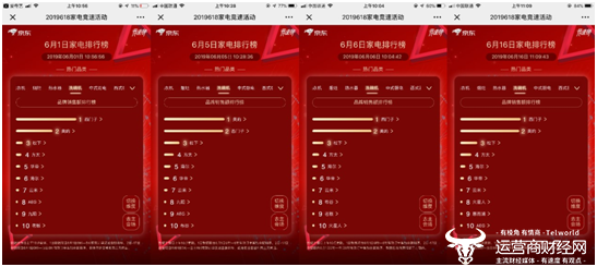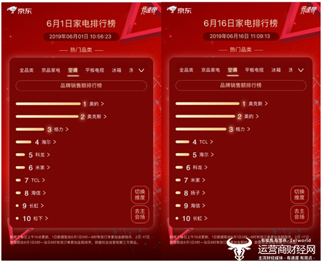 透过京东家电排行榜,我们发现,有许多家电品牌的销量相差微乎其微,几乎分不出胜负。就空调品类来说,6月1日开门红,美的一马当先夺得了空调榜单的冠军宝座。可是我们也可以看出,奥克斯虽位居第二,与美的却相差很小。果然,就在第二天,奥克斯一举反杀,抢到了第一的位置。翻看随后十几天来的榜单,奥克斯倒是稳稳的占着上风,可这并不代表他就是最后的赢家了,因为这十几天里,美的也是“咬定青山不放松”,一直紧追其后,相差甚微。