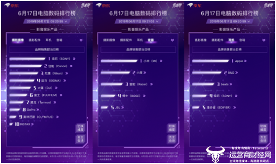 影音娱乐品牌销售额当日榜依旧保持多日来的稳定局面,索尼、佳能、尼康占据榜单前三。适马异军突起,占据榜单第4。今日的耳机榜单仍是Apple的优胜局面。而音箱榜单中,小米、小度热度不减,继续称雄。