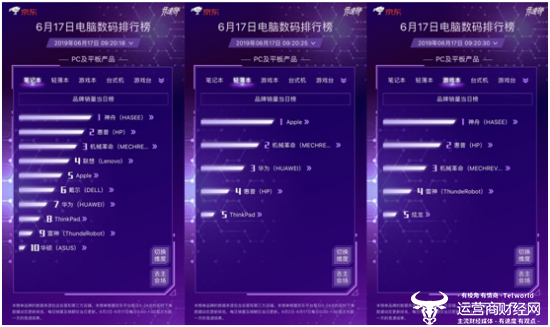 今日的PC及电脑平板产品品牌销量当日榜中,神舟夺下笔记本、游戏本双榜首位。而昨日表现十分亮眼的戴尔则呈现出“逆水行舟,不进则退”的竞争态势,三榜均处于5名开外,令人意料不到。Apple则夺回了轻薄本榜单首席;惠普分居笔记本、游戏本双榜次席和轻薄本榜单第4位,冲击冠军的机会极大。