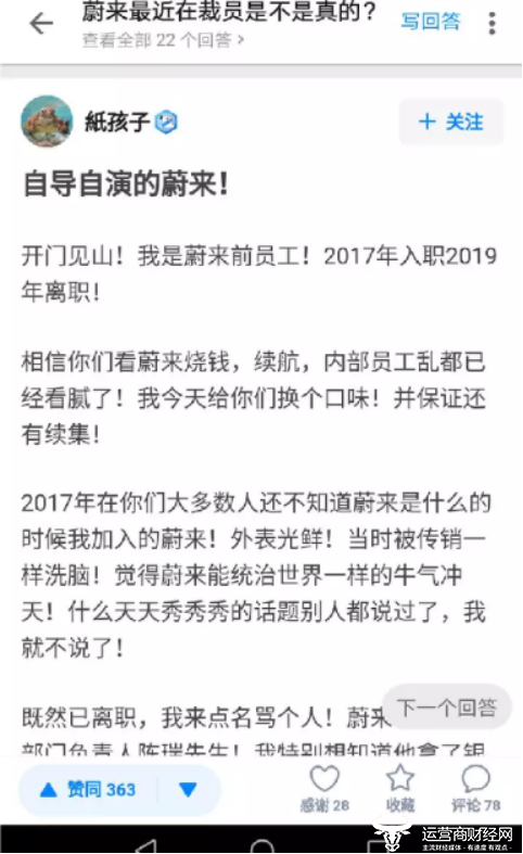 一般而言,企业业绩的连续滑坡坏反映了管理制度的弊端,蔚来汽车此前“裁员潮在知乎揭示内幕”的消息似乎也并不是空穴来风。