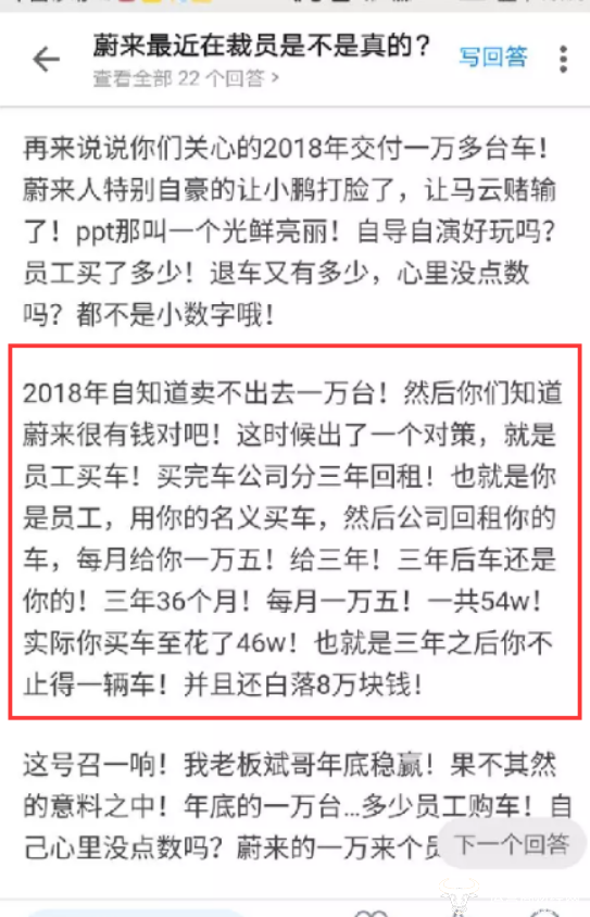 一名蔚来前员工在回答“未来最近裁员是不是真的”帖子时回答“相信你们看蔚来烧钱、续航、内部员工乱都已经看腻了”,他指出,蔚来2018年交付一万多台实际上是自导自演,其中很大一部分为员工购车,买完车公司分三年回租,每月一万五。