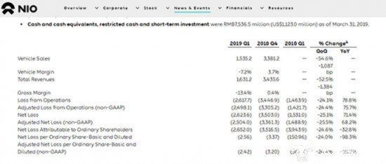 就此前蔚来汽车一季度财报显示,一季度蔚来汽车总营收16.31亿元,较2018年第四季度下降了52.5%;汽车销售额为15.35亿元人民币,环比下降54.6%;净亏损26.24亿元人民币,环比减少25.1%。