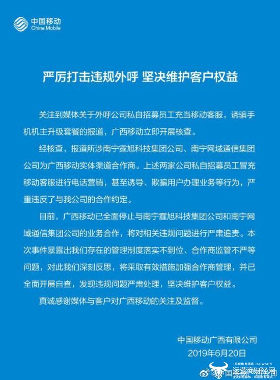 广西移动称,经核查,报道所涉南宁霆旭科技集团公司、南宁网域通信集团公司为广西移动实体渠道合作商。上述两家公司私自招募员工冒充移动客服进行电话营销,甚至诱导、欺骗用户办理业务等行为。