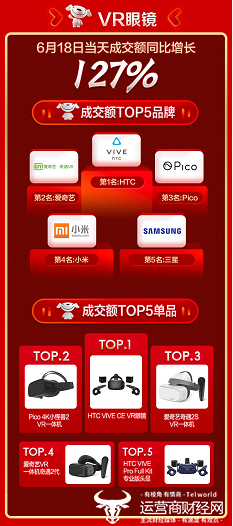 随着国家正式颁发5G牌照,中国5G时代的发展也正式进入了快车道,作为受益最大的技术之一,VR产品在东618期间也迎来爆发,VR眼镜6月18日当天成交额同比增长127%。VR眼镜销售额排名前5的品牌是HTC,爱奇艺、Pico、小米、三星,成交额TOP5单品是HTC VIVE CE VR眼镜、Pico 4K 小怪兽2 VR一体机、爱奇艺奇遇2S VR一体机、爱奇艺VR一体机奇遇2代以及HTC VIVE Pro Full Kit 专业版头显。