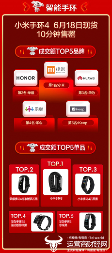 智能手环的销售同样表现不俗,618当天,小米手环4现货10分钟售罄,成交额TOP5的品牌依次是小米、荣耀、华为、乐心与Keep, 成交额TOP5单品分别是小米手环3、荣耀手环4标准版陨石黑、小米手环4石墨黑、华为手环B5运动版韵律黑、华为手环3 珍珠黑。