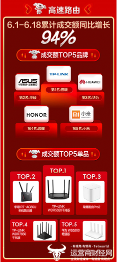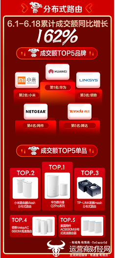 在今年的618期间,京东高速路由的销售额同比增长了94%,成交额前五的品牌为普联、华硕、华为、荣耀和小米;成交额TOP5单品分别是TP-LINK WDR5620千兆版、华硕 RT-AC86U无线路由器、荣耀路由Pro2、TP-LINK WDR7660千兆版以及华为 WS5200增强版。而分布式路由的成交额同比增长了162%,成交额TOP5的品牌是华为、小米、领势、网件和腾达,成交额前五的单品是华为路由器Q2Pro系列、小米路由器Mesh分布式路由、TP-LINK易展mesh分布式路由、领势VelopAC6600M高速路由器以及美国网件Orbi RBK53组合AC9000M分布式高速路由器。