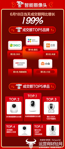 现在很多人都喜欢通过手机远程关注自己家里的状况,这也带动了智能摄像头消费的快速增长,6月18日当天成交额同比增长199%。京东618期间,智能摄像头成交额TOP5品牌为萤石、360、米家、海康威视、小白;成交额TOP单品分别为米家智能摄像机云台版、360智能摄像机云台版、萤石 C6CN 1080P摄像机、360智能摄像机小水滴以及萤石C6C 1080P无极巡航版。
