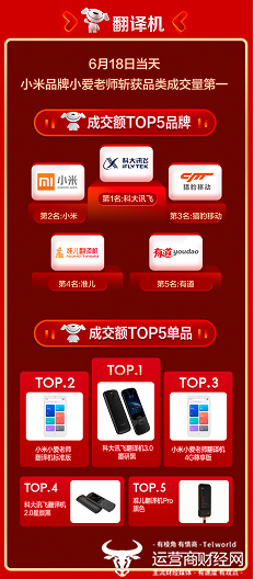 出行与孩子学习等使用的翻译机,今年也成为销量火爆的产品,小米品牌小爱老师6月18日斩获品类成交量第一。成交额TOP5品牌为科大讯飞、小米、猎豹移动、准儿、有道,成交额TOP5单品则是科大讯飞翻译机3.0墨研黑、小米小爱老师翻译机标准版、小米小爱老师翻译机4G尊享版、科大讯飞翻译机2.0星辰黑、准儿翻译机Pro黑色。