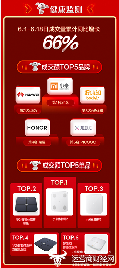 轻食、健身、健康生活的倡导下,健康检测类产品的需求量大幅增加,京东618期间健康监测品类成交量累计同比增长66%,成交额TOP5的品牌是小米、华为、好体知、荣耀、PICOOC;成交额前五单品则是小米体脂秤2、华为智能体脂秤黑色、小米体重秤2 、华为智能体脂秤京东纪念版和好体知智能体脂秤。
