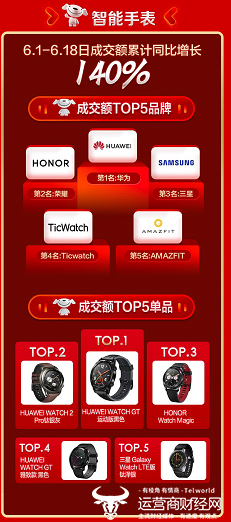 京东618期间智能手表类目的成交额累计同比增长140%,排名前五品牌依次为华为、荣耀、三星、Ticwatch以及AMAZFIT;而成交额TOP5单品则是HUAWEI WATCH GT运动版黑色、HUAWEI WATCH 2 Pro钛银灰、HONOR Watch Magic、HUAWEI WATCH GT 雅致款黑色和三星 Galaxy Watch钛泽银。