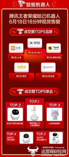 在早些年,机器人对于普通消费者来说还是一个可望而不可及的产品,随着各种各样智能机器人的问世,在今年京东618期间,智能机器人的销售也迎来了爆发,例如腾讯王者荣耀妲己机器在618当天18分钟现货售罄,而智能机器人成交额排名前5的品牌为科大讯飞、小米、腾讯态客、物灵、优必选;成交额前5的单品是腾讯机器人2.0王者荣耀妲己、科大讯飞阿尔法蛋大蛋、小米米兔故事机、科大讯飞阿尔法蛋S、和科大讯飞的阿尔法蛋A10。