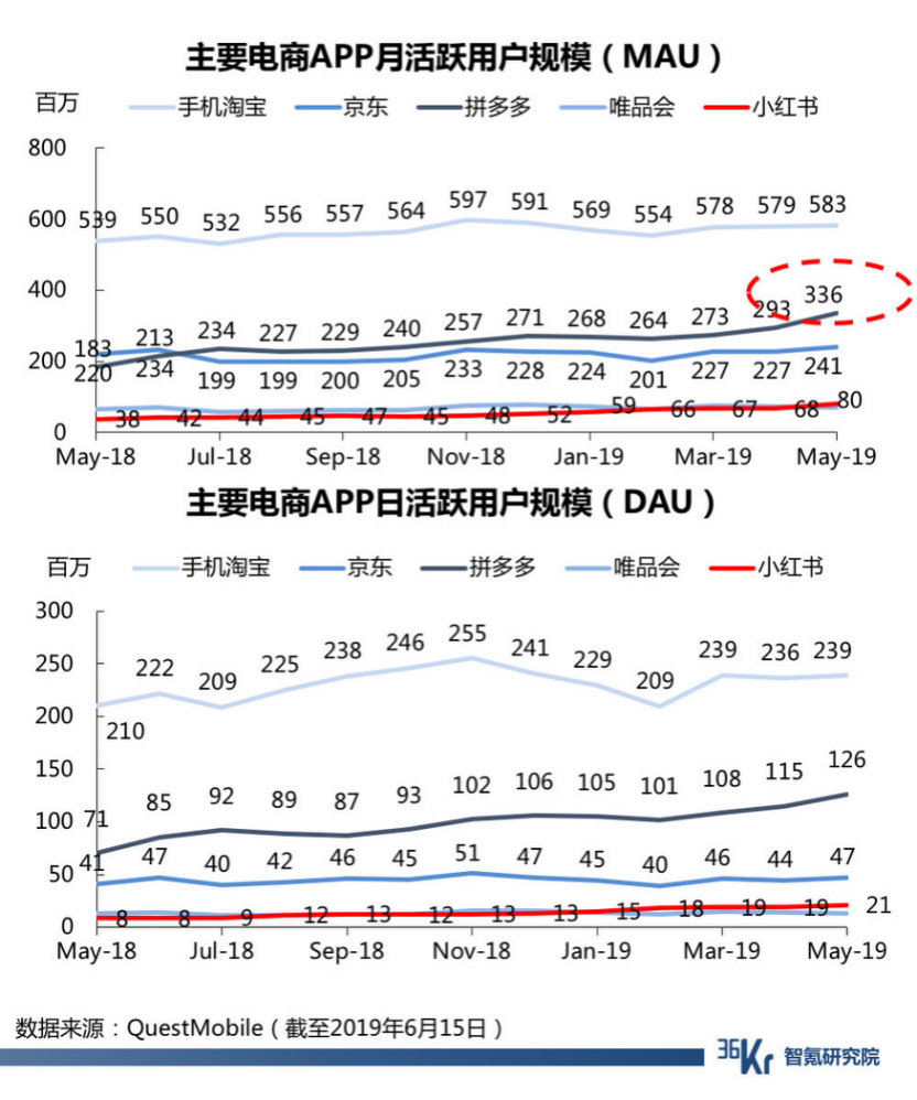 另据36氪智氪研究院援引Quest Mobile数据显示,新电商平台拼多多5月MAU已达3.36亿,同比增长83%,DAU(日活用户数)则增长至1.26亿,同比上涨79%,涨势迅猛。
