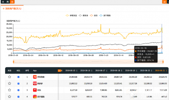 6月25日,国内权威数据平台QuestMobile相关数据显示,2019年618期间,拼多多DAU(日活跃用户)增幅位列三大电商之首,较去年同期增长48%,DAU由9138万净增4400万至1.35亿。其他主要电商平台中,京东DAU同比增长20%,由0.73亿增长至0.88亿;手机淘宝DAU同比增长9.1%,由2.74亿增长至2.99亿。从DAU净增长规模看,拼多多接近两倍于手机淘宝。