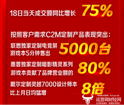 不仅如此,在追究京东618期间发布的战报时发现,京东以用户需求为导向,联合各大品牌打造的C2M定制产品表现极为亮眼。6月18日战报数据显示,联想独家定制电竞屏游戏本5分钟售出5000台;惠普独家定制暗影系列游戏本成交额占品牌营业额的80%;而618全新上线的戴尔灵越7000设计师本也实现环比5月(日均)猛增8倍的惊人成绩。在这些令人欣喜的数据背后,是用户对京东的信任和支持,也是品牌与京东深度合作的结果。