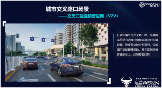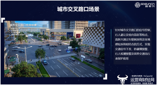 以交通应用场景为例,针对城市交叉路口的信号控制,行人避让及转向盲区等特点,高新兴通过车联网系统及环境感知系统相结合的方式,实现交通信号下发、防碰撞预警、行人检测预警及弱势交通出行者保护应用。