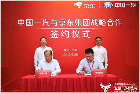 2019年6月28日,京东集团与中国第一汽车集团有限公司(下简称“一汽”)在北京京东总部签署战略合作协议。一汽集团公司党委常委、副总经理邱现东,京东集团高级副总裁、战略合作部负责人胡胜利出席签约仪式,一汽集团公司总经理助理兼战略管理部部长胡咏与京东零售集团企业业务大型客户部总经理李靖代表双方签约。协议约定,双方将围绕智能采购服务、智慧物流、市场营销、移动出行、智能物联网、公益事业、金融服务、后市场等一系列领域开展广泛业务合作,共同探索汽车行业“从产到销”的全链条数字化经营模式。