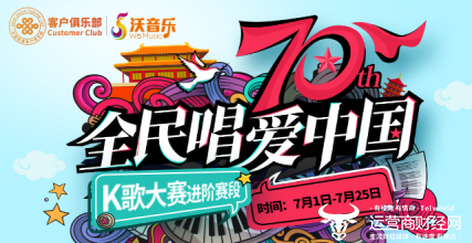 2019年,伟大的祖国即将迎来70周年华诞,诸多献礼活动也层出不穷。据悉,中国联通客户俱乐部、联通在线工会、联通沃音乐文化有限公司三方联合举办的“全民唱爱中国”K歌进阶大赛自7月1日起也正式启动。