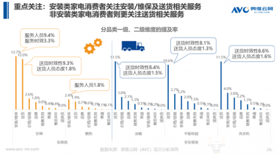 产品吸引用户,服务留住用户。除产品功能升级趋势外,《白皮书》也揭示出家电行业迎来服务消费时代。在消费升级的今天,价格已经不再是消费决策中的首要因素,服务因贯穿售前到售后全流程、深度影响消费体验,而成为用户更为关注的决策依据。《白皮书》显示,送货时效是消费者关注度最高同时也是差评率最高的服务项。除此之外,安装类家电(如空调、燃气热水器、净水器)服务关注度明显高于非安装类家电(如冰箱、电视、洗衣机、净化器),说明安装问题是消费者在购买家电时的主要关注点。