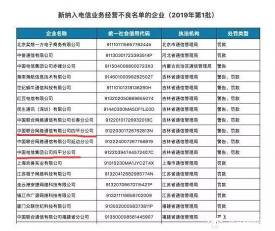 值得关注的是,这次各地通信管理局执法力度非常严格。除了民营通信企业外,中国电信、中国联通旗下的六家分公司也被“点名批评”。在这其中,中国电信吉林四平分公司便赫然在列。