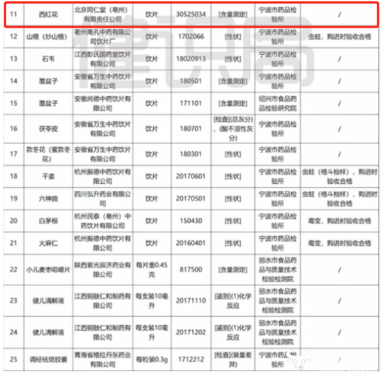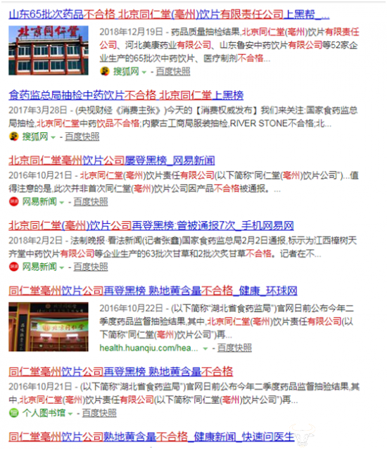 在2016年至2019年上半年,北京同仁堂(亳州)有限责任公司生产的不合格饮品涉及黄曲霉毒素超标、白矾、杜仲、土鳖虫等成分抽检不合格,且在重庆、浙江等多地食药监检测中上“黑榜”。