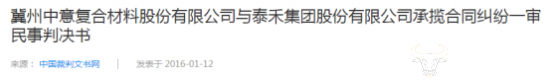 运营商财经网了解到,冀州中意复合材料股份有限公司与泰禾集团承揽合同一案涉及到的金额,还不到三万元,却弄到对簿公堂的结果,背后有何隐情就不得而知了。