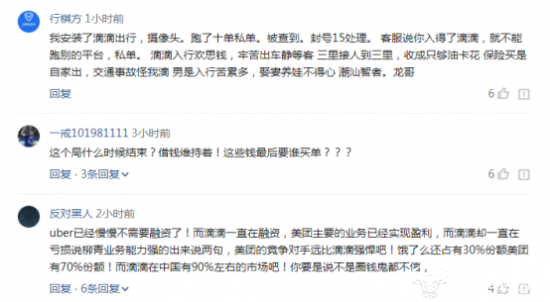 此消息一出,各路网友纷纷哀声怨道。滴滴司机抱怨平台不公,仿佛入驻滴滴平台,已经不再是一份养家糊口的美好差事。滴滴用户埋怨滴滴一味圈钱,老板身价两百多亿,滴滴占领中国90%的市场,却一直在亏损,融资就是在借钱,环环相扣,什么时候才能结束靠钱维持的局面?