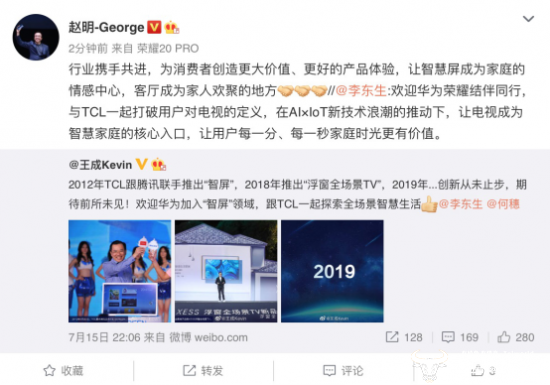 与此同时,运营商财经网还注意到,TCL李东生在微博发文称:“欢迎华为荣耀结伴同行,与TCL一起打破用户对电视的定义,在AI×IoT新技术浪潮的推动下,让电视成为智慧家庭的核心入口,让用户每一分、每一秒家庭时光更有价值。”赵明转发这条微博,表示:“行业携手共进,为消费者创造更大价值、更好的产品体验,让智慧屏成为家庭的情感中心,客厅成为家人欢聚的地方。”