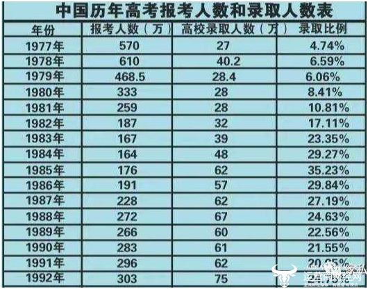 1977年,高考报考人数570万人,录取27万,录取比例为29∶1。约4.8%。