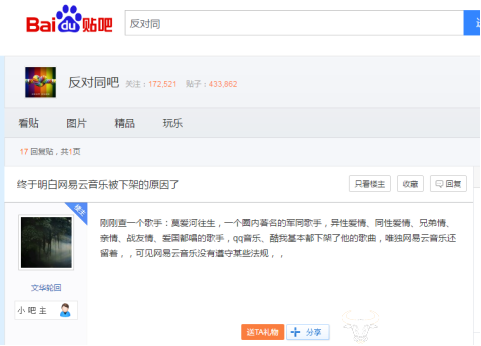 按照这个整治标准来看,在百度贴吧“终于明白网易云音乐被下架的原因了”中,楼主表示,“刚刚查一个歌手:莫爱河往生,一个圈内著名的军同歌手,异性爱情、同性爱情、兄弟情、亲情、战友情、爱国都唱的歌手,qq音乐、酷我基本都下架了他的歌曲,唯独网易云音乐还留着,可见网易云音乐没有遵守某些法规。”